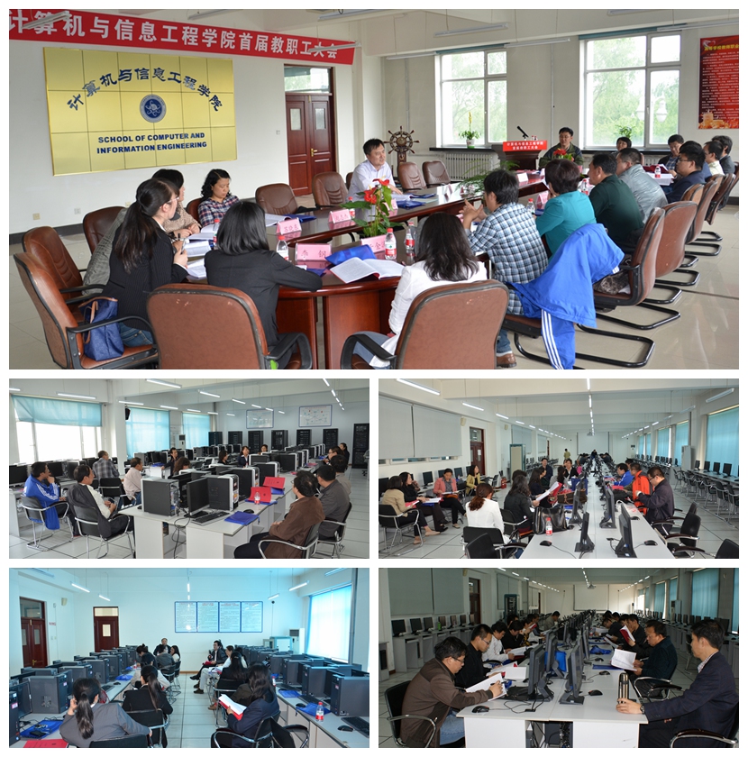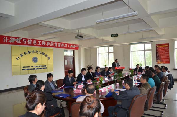 计算机与信息工程学院首届教职工大会于5月22日13:30在学院会议室隆重召开。校工会主席李晓梅、副校长张晓丹和工会副主席臧庆福莅临大会,全院教职工和特邀代表、列席代表出席大会,计算机与信息工程学院党总支副书记陈明军主持会议。