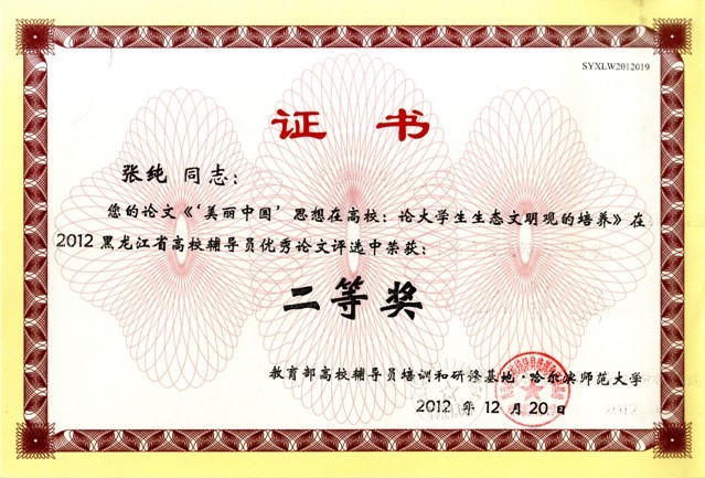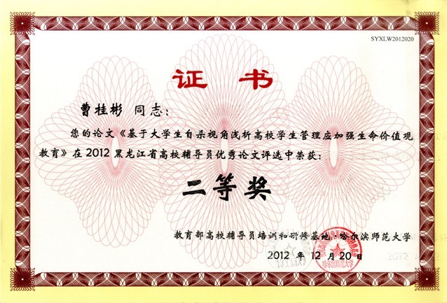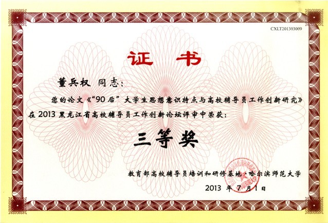 在2012-2013年度黑龙江省高校辅导员优秀论文评选和黑龙江省高校辅导员工作创新论坛中,我校副处级辅导员曹桂彬《基于大学生自杀视角浅析高校学生管理应加强生命价值观教育》和专职辅导员张纯《“美丽中国”思想在高校:论大学生生态文明观的培养》两篇论文,分别荣获教育部高校辅导员培训和研修基地(哈尔滨师范大学)授予的省级二等奖;专职辅导员董兵权《“90后”大学生思想意识特点与高校辅导员工作创新研究》和副处级辅导员曹桂彬《基于熵权模糊模型的高校思想教育质量评价》两篇论文,分别荣获教育部高校辅导员培训和研修基地(哈尔滨师范大学)授予的省级三等奖。