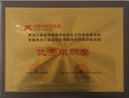 在2013黑龙江省高校优秀辅导员博客评选活动中,我校荣获教育部中国大学生在线和黑龙江省高等教育学会学生工作专业委员会联合授予的首届黑龙江省高校优秀辅导员博客评选活动“优秀组织奖”。