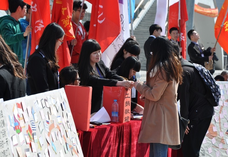 4月1日至4月4日期间,校学生会分别在A、C区食堂门口和南区摆放展台,开展募捐活动,与此同时,校工会通过全校分工会发动全校教工开展募捐活动。在募捐活动现场,魏美娇同学的室友及同学高举“将爱传递,点燃生命之光;情聚商大,圆梦美娇求学之路”的条幅参与校学生会组织的募捐活动,许多老师专程前往募捐点捐款;有的老师带着孩子来给美娇捐款;有些同学将自己身上所有的钱都捐了出来;还有很同学带来了班级集体捐款,并将自己的真挚祝福写在便笺纸上,汇聚成一面面“爱心墙”。一位环卫阿姨本来已经将自己兜里的钱都放进了捐款箱,一会又带着另一位大爷来给美娇捐款。4月1日中午,学校领导来到募捐现场为魏美娇捐款,4月3日上午,我校2001级校友王居伟先生在得知魏美娇的情况后直接来到学校捐出1万元善款。与此同时,学校相关部门也陆续接到众多校友及爱心人士的电话和善款,一时间,爱的暖流在商大里徜徉,爱心在校园中传递。