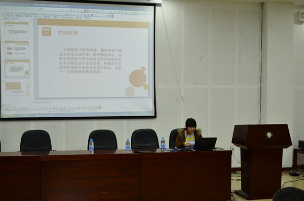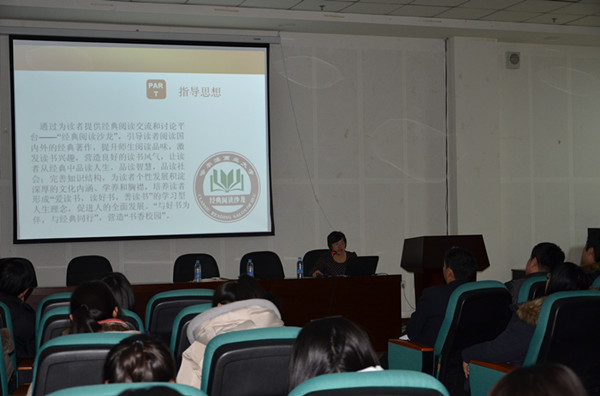 随后,陶颖馆长以多媒体的形式为大家做了“经典阅读实施方案”的报告,从指导思想入手,详细地介绍了哈尔滨商业大学经典阅读指导委员会的组织机构、活动内容和程序。每月定期在图书馆举行经典阅读沙龙并邀请众多专家学者到场,为学生读者深层次解读名著经典。细致入微的各项安排,让在场读者感受到图书馆之于读者的奉献与热忱。