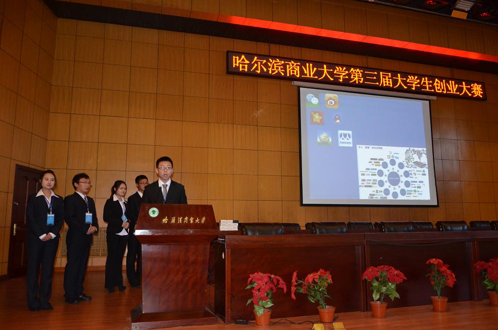 11月29日下午,由哈尔滨商业大学毕业生就业指导中心主办的第三届大学生创业大赛决赛在专家公寓国际报告厅举行。六个团队进入决赛,学生工作部白云龙部长、学生工作处冉庆国处长、校团委贾妮燕书记、毕业生就业指导中心赵炎主任、夏洪起老师担任了本次比赛的评委。