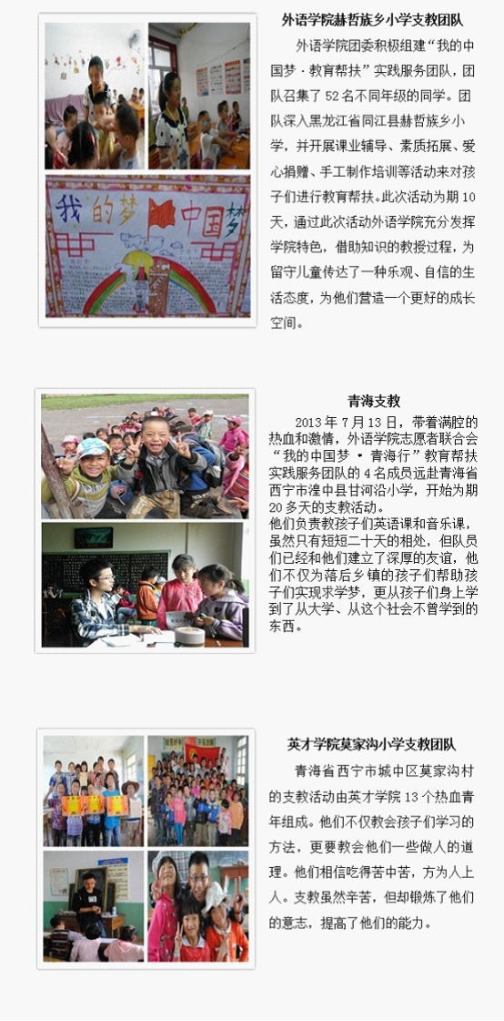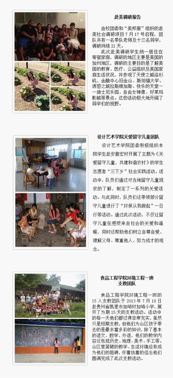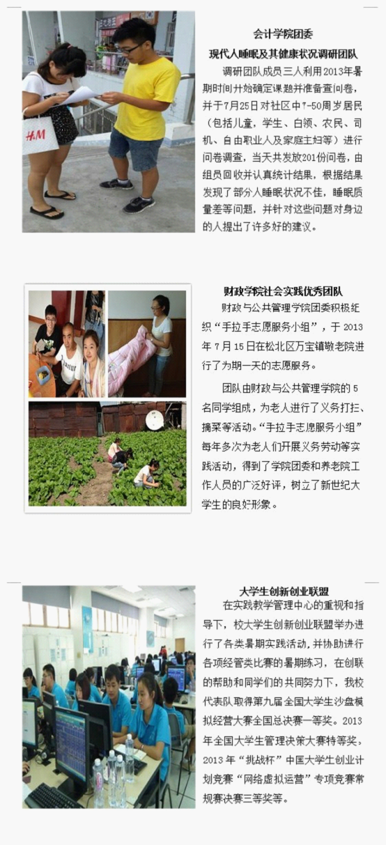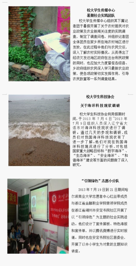 以实际行动激扬青春壮志,开启追寻“中国梦”的实践征程。暑期社会实践活动给生活在都市象牙塔中的大学生们提供了一个认识社会、接触社会、了解基层、展示青春的机会。我校团委结合上级团委通知精神于6月21日下发了《校团委关于做好哈尔滨商业大学2013年暑期文化科技卫生“三下乡”社会实践活动的通知》,明确了我校学生暑期社会实践的主题为“实践激扬青春志,奋斗成就中国梦”。通知下发以来,全校20个学院团委、8大校级学生组织、各类学生社团以及班级支部纷纷响应《通知》号召,利用假期围绕公益服务、教育帮扶、科技兴农、社会调查、帮孤助残、文明宣讲等实践形式精心设计、组织、开展了形式多样、内容丰富的实践活动。全校近40个实践团队、90名学生个人于近日向学校团委上交了详实、生动的实践报告汇报实践活动。一个月来,其活动足迹覆盖十余个省份,50余城镇,甚至远抵大洋彼岸;其身影活跃在城市及乡村、遍及繁华与僻远。并在实践中开拓了视野,增长了才干,认清了责任。团委将在腾讯官方微博上进行宣传、网络评选,请全校师生关注,支持你喜欢的团队。