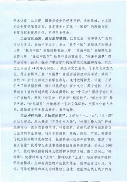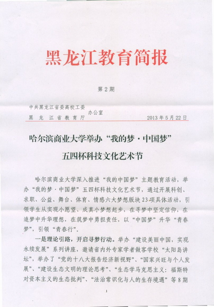 2013年5月22日,黑龙江教育简报2013年第2期单刊专题报道了我校“‘我的梦�中国梦’五四杯科技文化节”的相关情况。简报分四个部分简要介绍了我校“艺术节”的系列活动,体现了我校团委通过主题活动引领学生从实现小愿望、成真小梦想起步,在寻梦中坚定信仰,在追梦中升华理想,在筑梦中勇担责任,以“中国梦”升华“青春梦”,引领“青春行”。