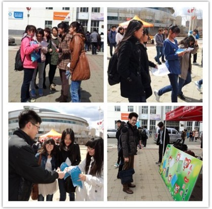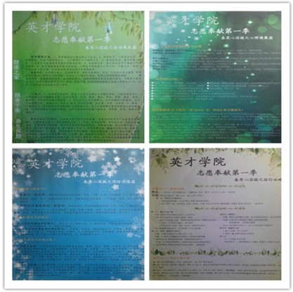 志愿服务活动可以使奉献精神得到彰显,增强社会责任感。为此,英才学院将陆续推出一系列志愿服务活动,提倡“互相帮助、助人自助”,使学生学会付出,充满热情,树立奉献、友爱、互助、进步的时代新风范。2013年4月19日中午,英才学院于A区食堂门口举行了“春寒心温暖”活动。参加此次活动的有学生会志愿者部、心理咨询部、外联部及勤工助学助学中心的阳光部。