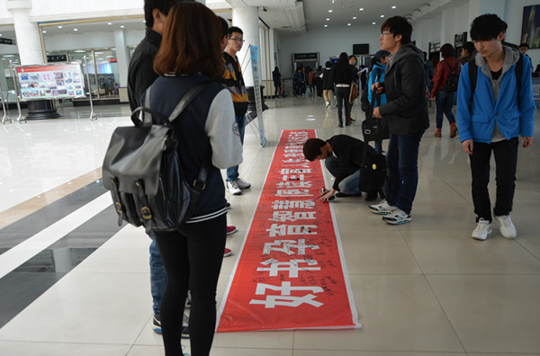 在“珍爱图书,阅过无痕”签名活动现场,前来签名的读者络绎不绝,他们在条幅上签下自己名字的同时,也签下了一份爱心,一份责任,一份文明阅读的承诺。