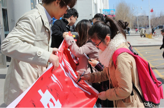 同学们在食堂门口踊跃参与活动签名