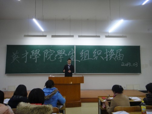 2013年3月14日晚6时,哈尔滨商业大学英才学院在4205教室召开学生组织主席团竞选大会,即选举新一届学生干部。出席本次大会的有英才学院党总支副书记孙颖老师,2012级辅导员吴竞老师,各部门负责人及部长等。