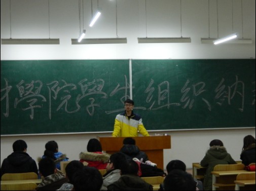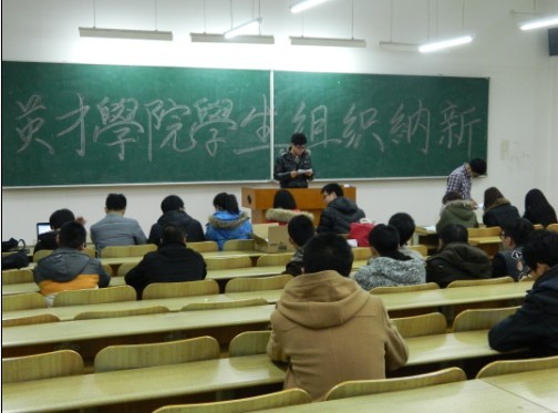 2013年3月15日晚6时,英才学院在4201和4202教室面向2012级学生召开学生会、院团委、学生党支部、勤工助学中心纳新大会。出席本次大会的有2012级辅导员吴竞老师,各部门负责人及部长等。会议由学生会王程林主持。本次纳新大会由院学生会统一规划,各部门协调配合。