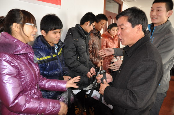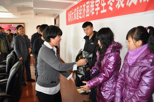 仪式上,冉庆国处长介绍说,一直以来,无论国家、省里还是我校都高度重视对家庭经济困难学生的资助工作,学校先后出台了多项重要措施,已经建立起了以国家助学贷款为主渠道,以国家奖助学金、勤工助学、困难补助、社会资助、“绿色通道”为辅的资助体系。仅这学期,学校和各学院从不同层面开展了形式多样的资助活动,如:9月份校庆期间学校拿出近50万元资金为每位家庭经济特别困难的学生发放困难补助、我校争取到省慈善总会捐资5万元,资助我校孤残学生、校工会正在号召全校教职工为困难学生捐款捐物等等。这次学校出资近10万元,为家庭经济困难学生购买了300多套冬装。