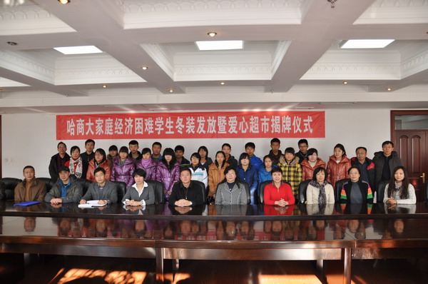仪式上,校党委副书记杨殿军教授和省教育厅学生资助中心副主任郭丽光为困难学生发放了棉衣并为爱心超市揭牌。