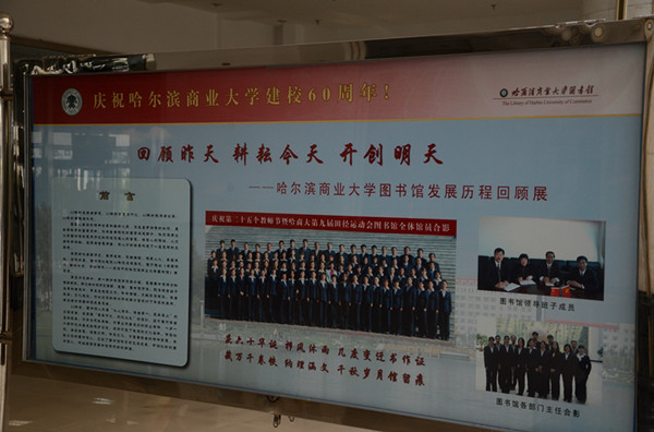 为庆祝哈尔滨商业大学建校60周年,由图书馆举办的《回顾昨天 耕耘今天 开创明天——哈尔滨商业大学图书馆发展历程回顾展》于2012年8月29日在图书馆二楼大厅正式展出。本次回顾展以图文并茂的形式,全面展示了图书馆60年的发展历程,通过“领导关怀”、“历史回顾”、“党建工作”、“科学管理”、“文献资源建设”、“读者服务”、“文化建设”、“对外交流”、“学术研究”和“丰硕成果”等方面进行了详尽的展示。