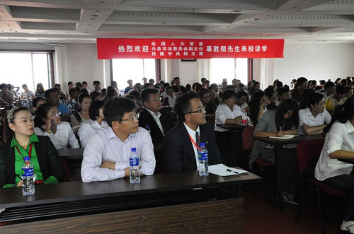 2012年9月8日,在哈尔滨商业大学欢庆60华诞之际,全国人大常委、内务司法委员会副主任、民建中央副主席、博士生导师辜胜阻教授,在黑龙江省政协副主席、民建黑龙江省委主委、博士生导师孙东生教授的陪同下,为管理学院全体教师、博士研究生、硕士研究生及本科生作了题为《中国“十二五”产业升级与企业转型》的学术演讲。