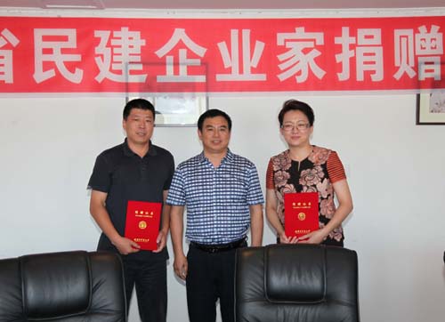 党委副书记李秉治向赵又霖、马任远董事长(左)颁发捐赠证书