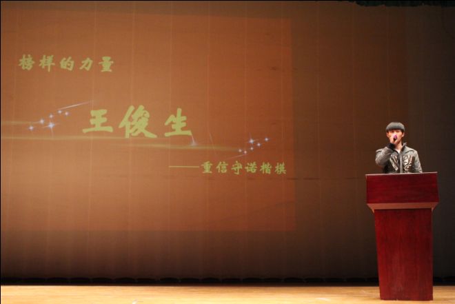 王俊生同学曾在2011年12月校团委举办的年度优秀学生标兵评选表彰大会上荣获由校党委书记刘德权教授亲自颁发的“优秀学生标兵”荣誉证书,并在2012年4月校团委举办的“榜样的力量”优秀学生事迹报告会中进行事迹巡讲,其感人事迹在师生中引起了热烈反响。