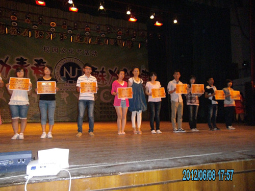 08级热能与动力工程二班孙宇航、09级热能与动力工程二班田宝双、刘芝林、10级热能与动力工程二班邓志鑫等四名同学获得2011—2012年度哈尔滨商业大学“校园先锋人物”。