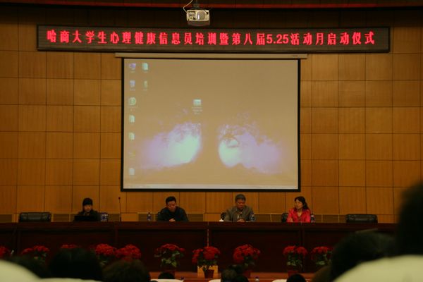 为贯彻落实省教育厅有关文件精神,宣传普及心理健康知识,加强学生心理健康信息员队伍建设,全面推进我校心理健康教育工作。5月7日下午5点30分,在专家公寓报告厅举行了我校学生心理健康信息员培训大会暨第八届“5·25”心理健康教育活动月启动仪式。校党委副书记杨殿军教授、教育厅心理健康教育培训基地专家哈尔滨工程大学葛喜平教授、相关职能部门领导,各学院党总支书记(副书记)、团委书记、辅导员老师和各学院选配的学生心理健康信息员参加了培训和启动仪式。启动仪式由我校学工部部长白云龙老师主持。