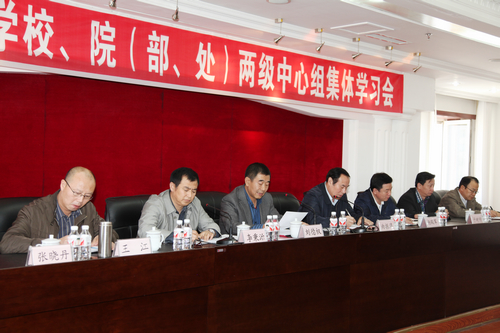2012年5月17日下午,校党委在A区行政中心六楼会议室组织召开校、院(部、处)两级中心组集体学习会。两级中心组成员参加会议,党委书记刘德权同志主持会议并作重要讲话。