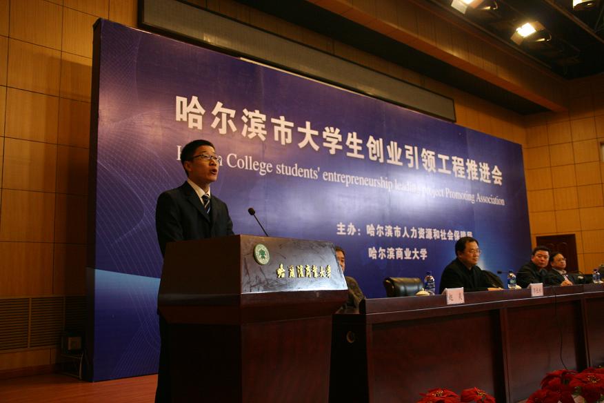 会议由哈尔滨市人力资源和社会保障局大中专毕业生就业与创业中心主任邵长秋主持,哈尔滨商业大党委副书记杨殿军致辞,哈尔滨市人力资源和社会保障局党委书记刘志军进行了讲话,首届黑龙江省大学生创业大赛三等奖获得者、我校管理学院08级市场营销专业孙成铭同学发言。