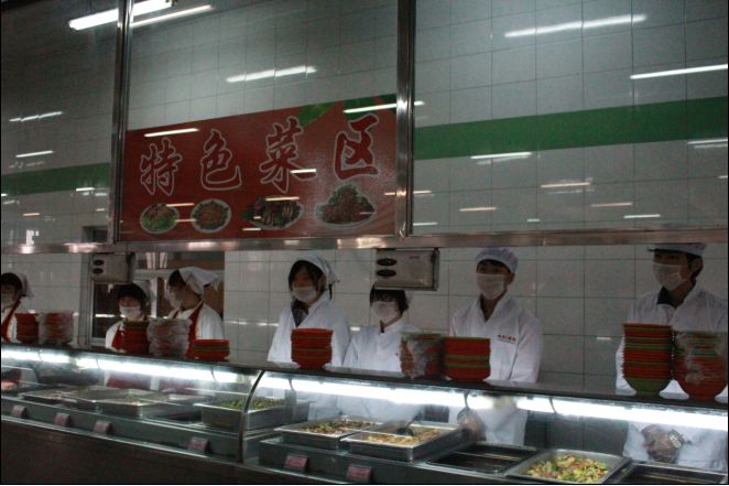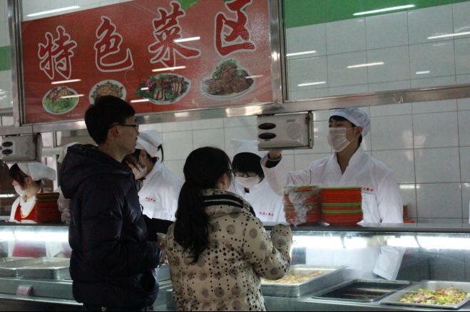 在食堂里,前来帮厨的志愿者正为前来就餐的同学刷卡、盛饭,角色的转换使他们体会到食堂工作人员的辛苦,加深了理解。