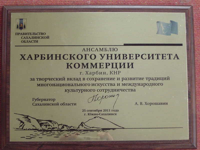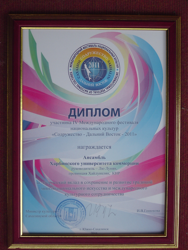 在艺术节开、闭幕式上,萨哈林州文化部部长科纽科娃和萨哈林州州长霍洛沙文分别向刘龙洋处长颁发了奖状,表彰哈尔滨商业大学为本届国际民族文化艺术节做出的贡献。俄罗斯联邦电视台采访了贾妮燕副书记并在电视黄金时间播放了我校艺术团的舞蹈演出。