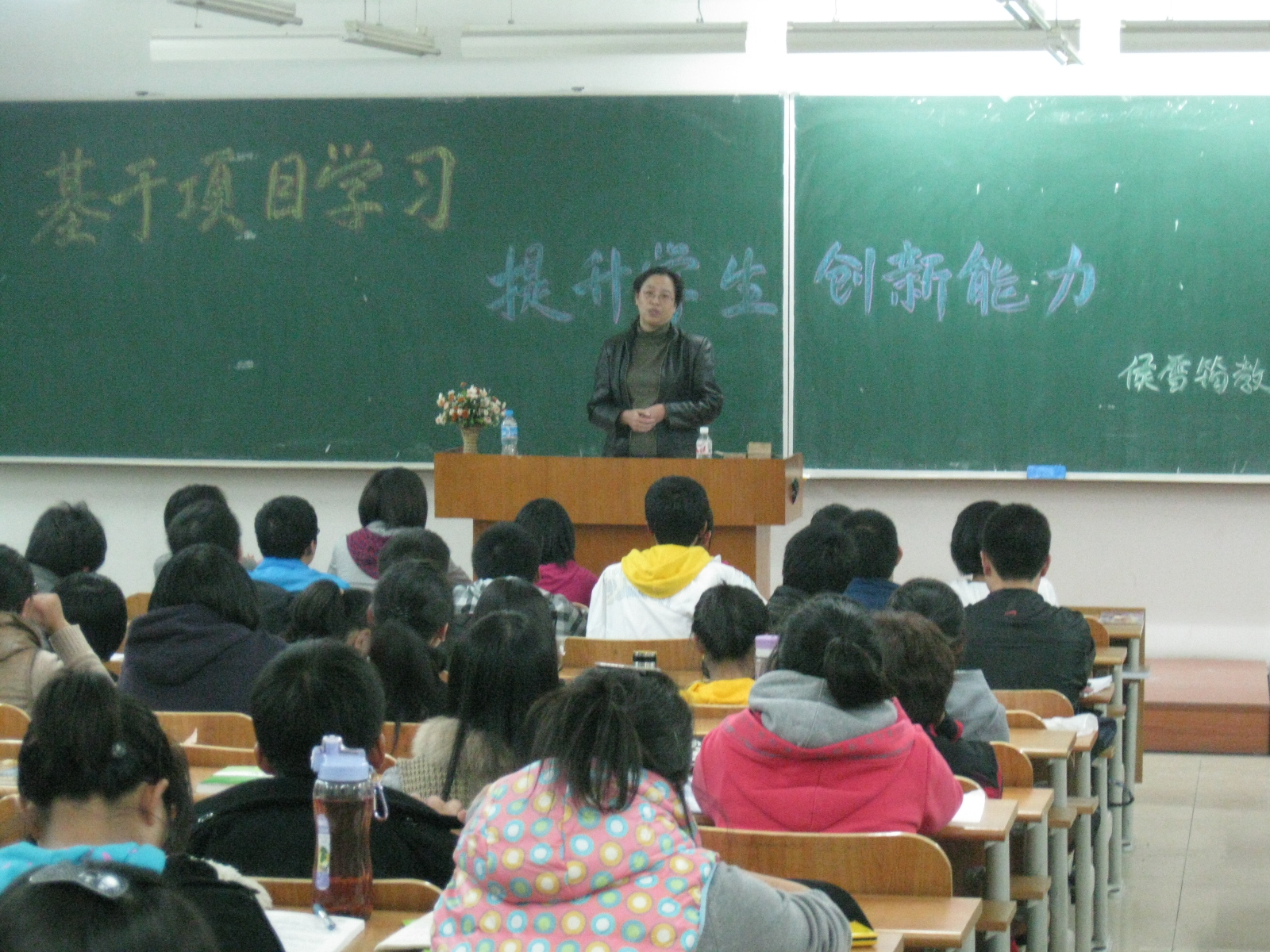2011年10月13日下午17时,人才培养实验班党委书记侯雪筠教授在3404教室为2011级人才培养实验班的全体同学做了以“基于项目学习 提升学生创新能力”为题的讲座。