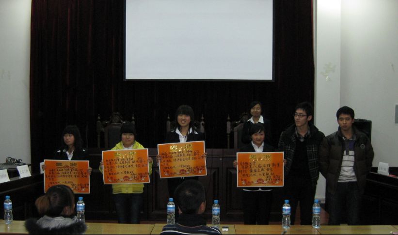 11月20日下午。决赛如期在模拟法庭举行,4支队伍统一整齐的服装、翩翩的礼仪风度、饱满的精神状态以及高水准的论辩技巧,为嘉宾评委及观众们奉献了两场精彩的比赛。最终由孙春生、赵百耕、杨婷、梁永林4位辩手组成的队伍力压其他三强夺得了冠军。在比赛结束后进行了颁奖仪式,为4支队伍及辩论赛各阶段最佳辩手、最佳领队等奖项获得者颁奖。法援工作部第十一届执行部长吴若曦为比赛进行了点评和总结。在热烈的掌声中,本次辩论赛圆满落幕。