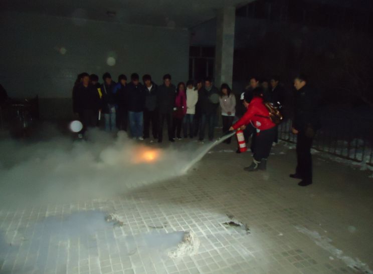 为了教会大家正确使用灭火器,孙处长向同学们讲解了灭火器的构造以及使用方法。同学们还在保卫处人员的引导下,在室外进行了灭火器的实际操作,取得了良好的效果。