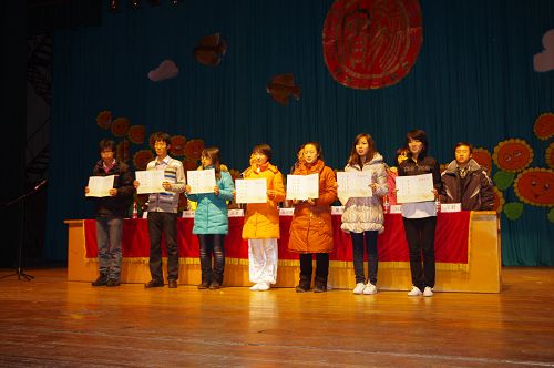 表彰大会由孙颖老师主持。此次大会对获得校级优秀学生奖学金、优秀大学生、优秀学生干部、优秀团干部、优秀团员、军训优秀学员以及校园之星的同学进行了表彰,到会的老师为获得各项奖励的同学颁发了证书。随后,获奖学生代表08级学生王悦、09级学生王博、10级学生李想同学进行了发言。最后教师代表隋如彬语重心长的讲话深深地鼓舞了在场的每一位同学。最后,表彰大会在全体实验班同学合唱的《团结就是力量》的嘹亮歌声中圆满结束。