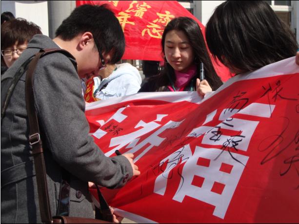 同学们在祈福条幅上签名