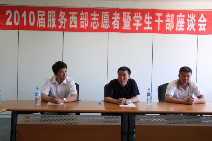 6月22日上午,2010届服务西部计划志愿者暨2010届学生干部座谈会在我校东区B03号楼三楼会议室召开。校党委副书记杨殿军教授、校团委白云龙老师出席了座谈会,与即将奔赴西部计划服务岗位的志愿者及主要学生干部代表进行了亲切的交流。