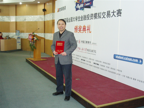 颁奖典礼由中央人民广播电台经济之声的节目主持人---纪春主持。中国工商银行北京市分行个人金融业务部总经理李育华、世华财讯副总经理李新元、中国人民大学财政金融学院党委副书记黄文彬、中国新闻网副总裁王亮、财讯.com运营中心总监姚全以及来自全国各地的获奖教师和学生代表200多人参加了颁奖典礼。我校派优秀指导教师金融学院的庞海峰副教授参加了颁奖典礼!