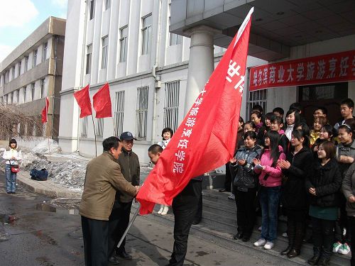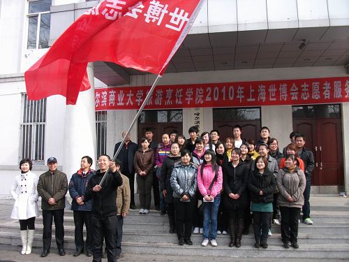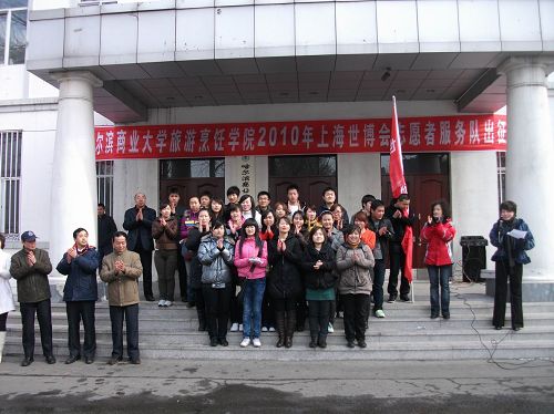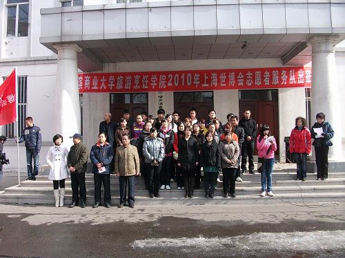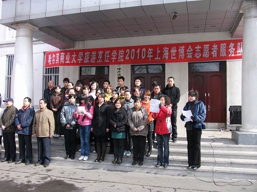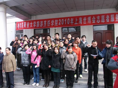2010年3月26日,哈尔滨商业大学旅游烹饪学院为上海世博会志愿者服务队举行了出征仪式。30名志愿者满怀激情即将踏上赴上海服务世博的光荣征程。哈尔滨商业大学学工部部长王永发老师、党委宣传部副部长潘俊峰老师、旅游烹饪学院院长石长波教授、党总支书记郑昌江教授、副院长张培茵教授、副书记李晓阳副教授、校团委副书记贾妮艳老师出席,为志愿者送行