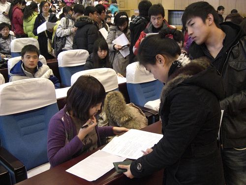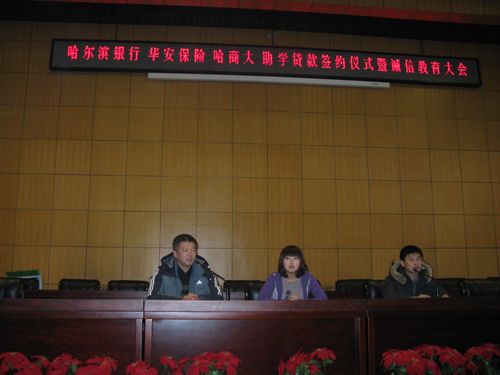 12月30日下午1时30分,哈尔滨银行、华安保险公司、哈尔滨商业大学09年度国家助学贷款签约仪式暨诚信教育大会在我校专家公寓国际报告厅举行。我校本年度申请国家助学贷款符合条件的学生现场进行了签约,同时,学校老师、银行和保险公司的工作人员也从不同角度对贷款学生开展了一次诚信教育并当场举行了诚信宣誓。