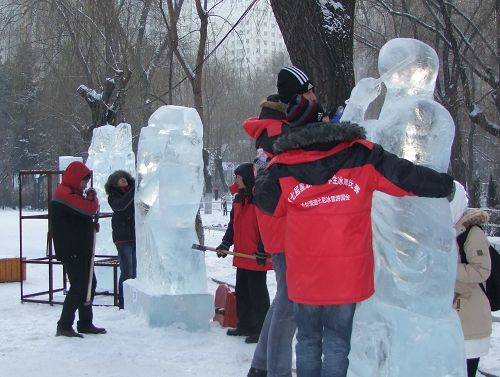 设计艺术学院参赛学生,专心致志地创作冰雕