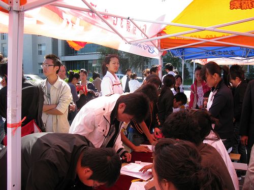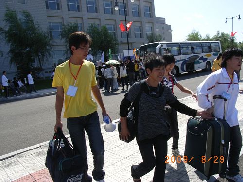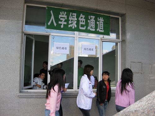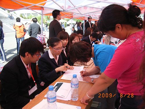8月28、29、30日是我校2009级新生报到的日子。每天一大早,车队即派出多辆大客车,往返火车站,迎接新生及家长。学生处、学工部、财务处、体育学院等各职能部门均实行现场办公,方便新生集中办理注册、缴费、领取军训服装等入学手续。学校还为困难学生设立了绿色通道,方便他们办理入学手续。各学院分别在南区主楼广场和新区体育馆前的下沉广场支起了色彩艳丽的帐篷,摆放了桌椅和介绍本院情况的展板,挂起了欢迎新同学的横幅和彩旗,老师和同学们面带微笑,热情为新生服务。广场外围的帐篷下,还设立了若干个饮水处,方便报到的新生及家长饮水。校学生会设立了新生服务台,为新生引路,提供咨询等服务。保卫处的校警、校学生会的志愿者也在现场引导人流、维持秩序。