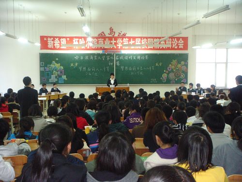 “我思故我在,我辩我精彩”。今年是五四运动九十周年,为激励广大青年继承和发扬五四运动的光荣传统,构建“节约型、关爱型、文化型”校园,培养当代大学生勇于探索、敢于创新、寻求理性的精神,校团委、校学生会于2009年4月16日下午5:30在我校新区4106教室举办了“新希望”杯哈尔滨商业大学第七届校园精英辩论会。