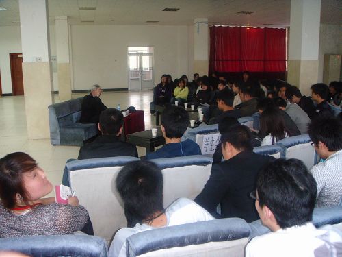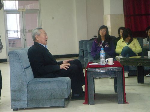 轩振军老人动情的讲述深深的吸引了同学们,会场上不时发出阵阵掌声。最后,老人对学子们提出了建议和忠告,告诉我们应该珍惜宝贵学习时光,特别提出作为商业大学的学生更应确立自己的发展方向,为社会主义市场经济建设而努力学习。