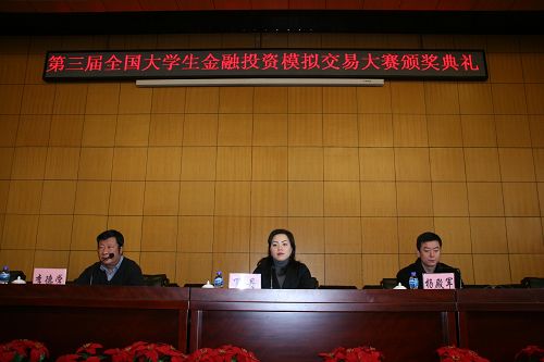 2009年3月26日上午,世华财讯杯第三届全国大学生金融投资模拟交易大赛东北赛区颁奖典礼在我校专家公寓学术报告厅隆重举行。出席颁奖典礼的嘉宾有:哈尔滨商业大学党委副书记杨殿军教授,世华财讯副总经理罗丹女士,哈尔滨商业大学党委宣传部部长李德学教授,哈尔滨商业大学团委书记王志浩教授,实践教学管理中心主任张莉教授,世华财讯大连分公司总监王舰先生,市场部总监杭亮先生,以及哈尔滨商业大学金融学院、会计学院、管理学院、经济学院、财政与公共管理学院的党政领导。吉林大学、辽宁金融职业学院、辽宁对外经贸学院、辽宁大学、哈尔滨金融高等专科学校、哈尔滨德强商务学院等高校的代表和我校四百余名师生欢聚一堂,共享收获的喜悦。