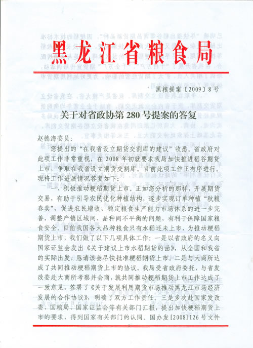 委员赵德海教授提交的《在我省设立粮食期货交割库的建议》提案,受到了副省长吕维峰、省政协副主席王涛志的高度关注,并在会上进行了交流发言。吕维峰副省长充分肯定这一提案对我省“千亿斤粮食产能工程”具有重大的战略意义,并责成相关单位立即落实。同时还得到北大荒集团、黑龙江绿色食品集团有限公司、黑龙江省银河期货公司等实体单位的大力支持和关注。会后,省政府向国务院有关部门进行汇报,其中有些具体内容已得到落实,部分内容在国家有关部门待批。同时,该提案也受到社会媒体的高度关注,黑龙江省电视台、黑龙江省日报社、黑龙江画报社等媒体分别进行了采访。