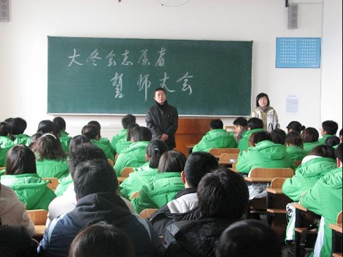 2009年2月9日下午,我校大冬会志愿者服务团誓师大会在校南区主楼402教室隆重举行。校党委副书记杨殿军教授、校团委书记王志浩老师、校团委王鹤腾老师出席了大会,会议由团委贾妮燕老师主持。112名志愿者豪情满怀将带着全校师生的期望正式走向大冬会志愿服务岗位。
