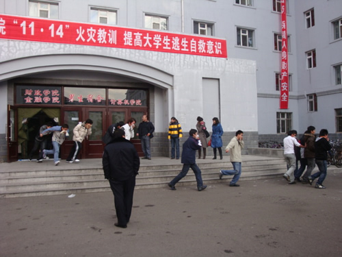 演习开始前,学校保卫处处长孙广文介绍,11月14日上海商学院发生了火灾,四名女大学生跳楼身亡,这给所有的高校敲响了消防安全的警钟。我校党委和校领导非常重视学生宿舍的安全问题,主管保卫工作的刘德权副校长强调,一定要把安全检查和消防实战演练当作都等大事来抓,坚决杜绝火灾隐患。保卫处提出了“奋战47天,确保安全年”的口号。11月20、21日,舍务中心、校办及后勤总公司对学生宿舍进行了联合检查,没收了31条电褥子、11件违规电器。孙处长表示,此次消防演习是为了提高学生防火的意识,教育学生要学会保护自己,在火灾中有效利用安全方法逃生,同时也为大冬会的召开营造一个安全和谐的大环境。孙处长还强调,以后每年春季的4月17日、新生入学、秋季的11月9日学校都会进行消防演习。