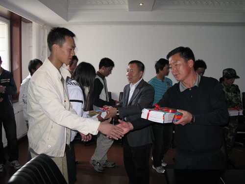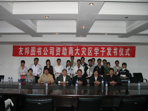 据悉,今年6月份王总经理就提出了要资助我校灾区同学,为其提供四年书费,今天终于如愿为我校来自甘肃和四川灾区的15名同学捐赠了图书,这些图书主要是学习用的教材。今后每学期初友邦图书公司都将继续为他们捐赠图书,帮助他们顺利完成学业。