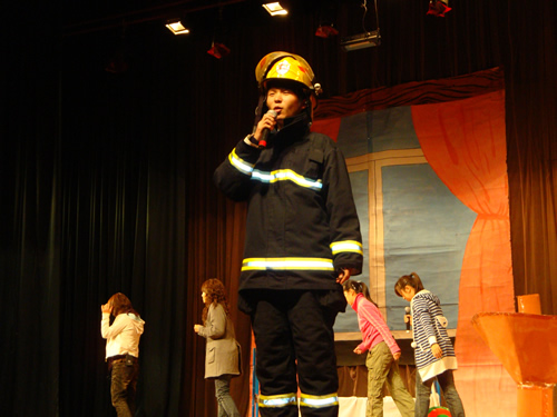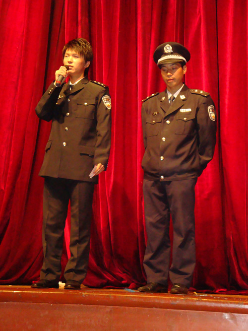 本次话剧由校大学生传媒中心学生们策划及演出,主要面向刚入校的08级新生,力求用这种寓教于乐的安全教育方法,让新生们对安全知识有更直观和深入的了解,使他们在入校之际就能有良好的安全防范意识。整场话剧从寝室用电安全、寝室贵重物品的保管、夜间出行安全等大学生活中常出现的问题为主线进行了编排。华丽的舞台背景、幽默风趣的台词和引人入胜的故事情节吸引了在场的同学,同学们阵阵的笑声和热烈的掌声连续不断。同时,话剧中还穿插了许多校园安全教育小知识及同学们在日常生活中应注意的问题,以形象的方式达到加强同学们安全意识的目的。两场话剧的演出中,都有幸请到了今年3月因与歹徒搏斗而负伤住院一个月的我校校警英雄朴星哲,朴星哲的到场使得南、北两区的同学都深受感动和鼓舞,随着主持人对朴星哲事迹的介绍,全场气氛达到最高潮,同学们给与朴星哲经久不息的掌声以示敬意,同学们对校警的敬重之情油然而生。