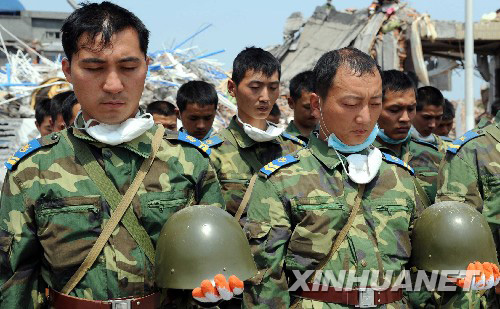 5月19日14时28分,在位于四川地震灾区的绵竹市汉旺镇,参加抗震救灾的空降兵某部战士在向汶川地震遇难者默哀。