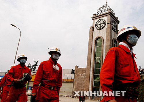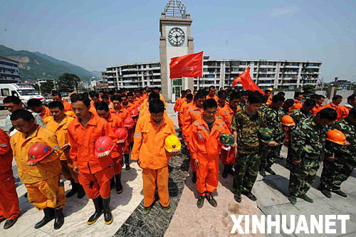 5月19日14时28分,救援人员在四川省汉旺镇汉旺广场的大钟前默哀,悼念四川汶川大地震遇难者。新华社记者王建华摄