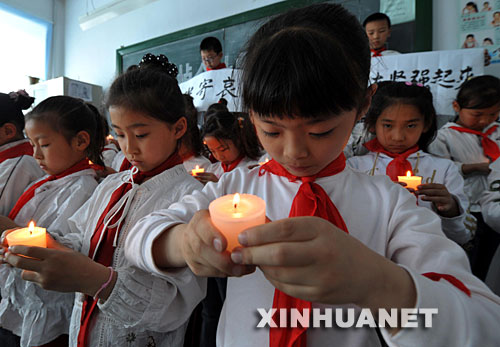 5月19日14时28分,哈尔滨解放小学学生在哀悼四川汶川地震中的遇难者。新华社记者李勇摄