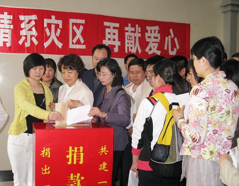 在抗震救灾的日子里,许多感人至深的事迹给人们留下了深刻印象:躺在病床上的离休老领导李殿钧教授委托家人捐献1000元,终身教授、84岁高龄的洪伯铿教授从厦门寄来1000元,退休教师、部级优秀专家罗宪祯教授捐款4000元。一些学生将自己的奖学金、助学金、贫困生补助金,甚至自己的伙食费都捐献给了灾区。一百余名来自四川、家里也受到一定损失的学生,21日下午组织起来进行捐款,他们说,全国人民都在支援四川,我们更是责无旁贷,受小灾的家乡人理应支援受大灾的父老乡亲……