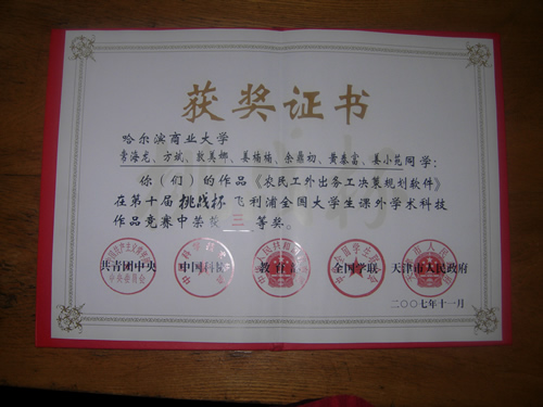 2007年11月18日,中国教育报第一版对我校参赛作品《农民工外出务工决策规划软件》进行了报道,并充分肯定了软件开发对解决农民工外出的盲目流动问题的实际指导意义。