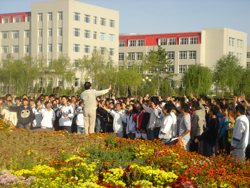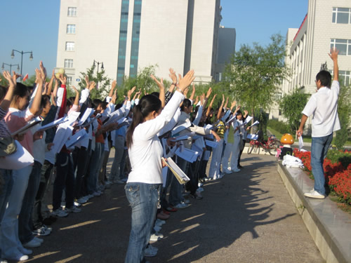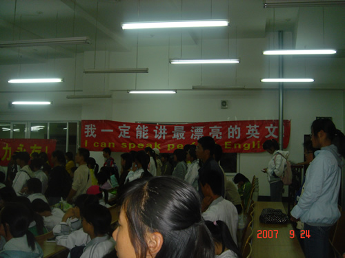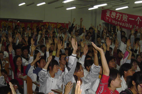 他还告诉同学们,努力一定要在选择之后,一定要为自己的目标坚持不懈,毫不怠慢。永远要保持激情保持疯狂,社会是公平的,不会因你自己而改变。然后,刘老师用他自己独特的幽默的语言带领大家一起 “ 喊 ” 英语,他还告诉大家,练习英语首先要做到发音最清晰,在最清晰的基础上做到最大声,最快速,同时他也强调鼻音、腔音的重要性,练习口语的有效方法就是练,玩命的练!这让在场的所有同学都受益非浅,大家也都积极主动的加入到 刘 老师 “ 喊 ” 英语的行列中。整个会场顿时象被点燃了一样,气氛异常活跃.